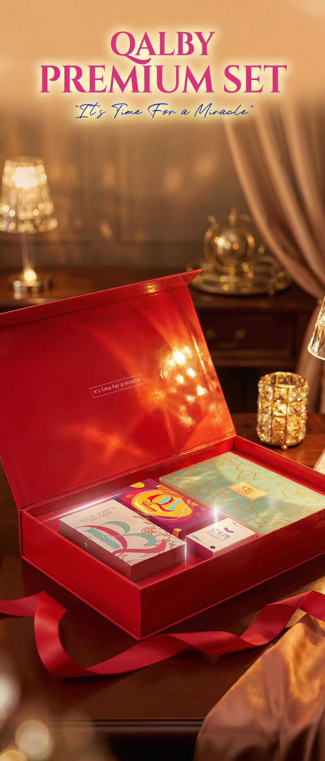 Qalby Premium Set – Semua yang anda perlukan untuk beauty & wellness dalam satu kotak mewah! Makeup, scarf, perfume & supplement, lengkap dalam satu set. Perfect untuk treat diri sendiri atau hadiahkan pada yang tersayang. Keterujaan, gaya & kesihatan, sempurna untuk setiap hari!